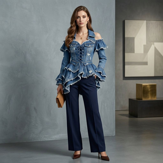 Cold-Shoulder Lace-Up Denim Peplum Jacket – Ruffled Hem Statement Top