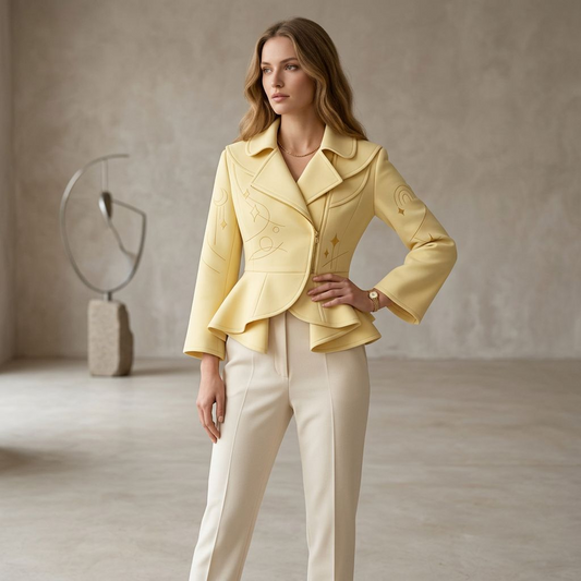 Butter Yellow Peplum Jacket – Embroidered Celestial Motif Structured Lapel Blazer
