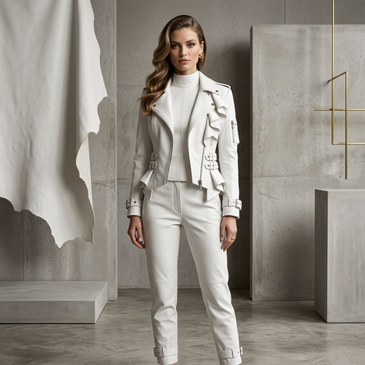 White Ruffle-Front Peplum Moto Jacket – Asymmetric Zip Belted Waist